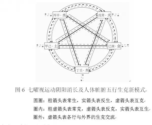 7 指出传统五行生克模式的局限性,依七曜阴阳及天人合一,建立了五行生克新模式,行间存在10对互生、10对互克关系。