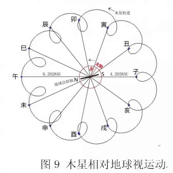 从图9可看出,木星除午-子外,分处未-丑、申-寅、卯-酉、辰-戌、巳-亥时两向并不完全相对,只是大体相对,加上地自转轴的偏角,地支化气本应为12年,与地支化气6年周期性相悖。为此,王冰形象地将其对地的影响犹如一个是太阳光照射,一个是月球反射太阳光之月光照射,将其一称正化,另一称对化。立足于北半球来看正化和对化,应将午、未、申、酉、戌、亥化气为正化,子、丑、寅、卯、辰、巳化气为对化。十二地支化气的天文学背景是木星运动,周期严格说应约为12年。
