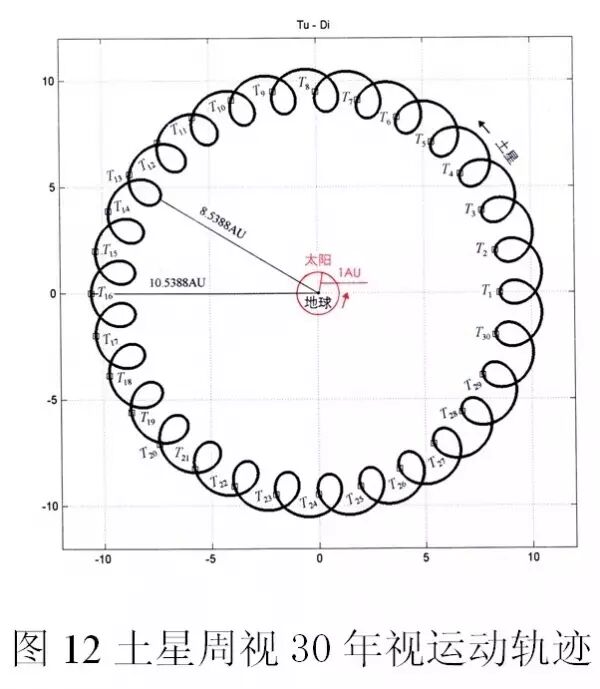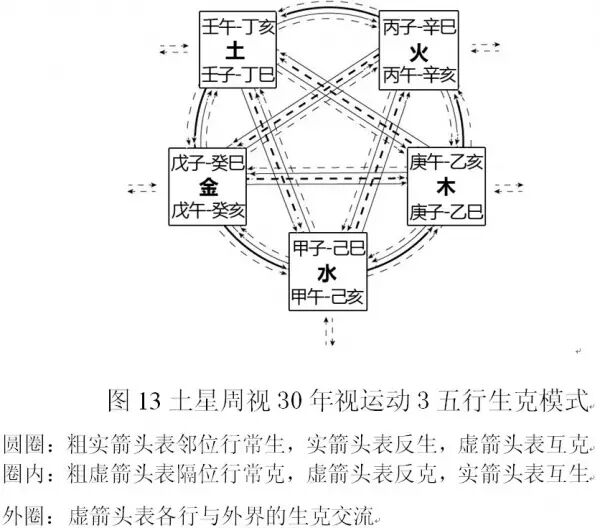 笔者等在文献[13]中讨论了土星的周30年视运动轨迹如图12所示;其阴阳周30年周期性消长五行生克模式图13所示[35] 。