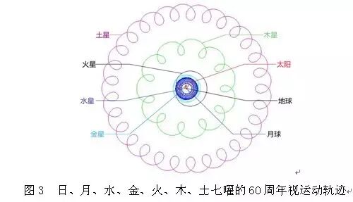 综述上两个发现表明:七曜对地、对人视运动具有60年的准周期性,施加给地、人体影响的准周期为60年,这个规律称为天人合一第1规律。日、月、水、金、火、木、土七曜的60年周期视运动轨迹如图3所示[15] 。