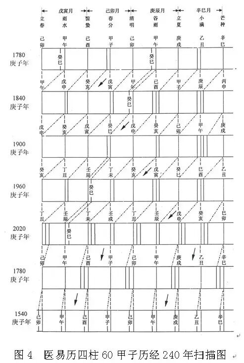 至唐代,大医家王冰、大易家李虚中等已发现,干支农历作为中医学、易学时标,其干支纪年、纪月有误。王冰认为十天干化五运、十二地支化六气描述的气象、物候变化周转周期应是回归年,干支农历中干支纪太阴年必定有误。李虚中继而认为,既然干支纪的年是回归年,干支纪月也应是以回归年为基础,将太阳周年视运动等分为十二段以之为太阳历的十二节月,干支农历中干支纪朔望月必定有误。李虚中、王冰等先哲们对干支农历作了重大唯象修正,创新出医易历。后得到元代大农学家王桢农学历《农书·授时指掌活法之图》(图1)的有力支持[7]。千百年来实践表明,医易历较能全面反映日、月、水、金、火、木、土七曜对人体的影响,可作为中医学、易学时标,用于医学预测和人生健康预测。但由于长期说不清天干、地支、60甲子等背后玄机,干支农历为什么错,医易历为什么对,千百年来医易历只能口授秘传,形成与干支农历并存的千古心照不宣困惑悬案。