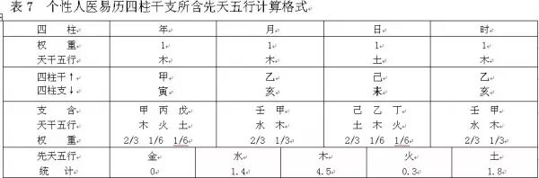 (4)四柱干支五行权重总数为8,每一行平均权重1.6,这反映共性健康人的五行平衡权重数。若某个性人的金、木、水、火、土五行数大体在1.6左右,表示该人的先天脏腑五行中和,一般健康。