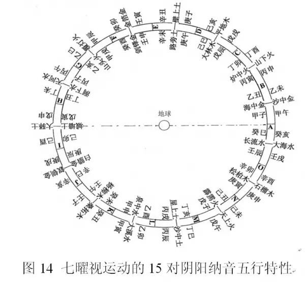 60甲子纳音五行在医易学中是个十分重要的慨念,如表5所列,有着广泛的应用,如可依年纳音五行与相应年干支正、天五行的生克关系,预测自然灾害,依四柱纳音能深入预测人的性格、健康特征、婚配等,但其背后玄机一直是千古之谜。笔者等破解其天文学背景是水、金、木、土、月五曜准周60年视运动每2年加在人体五行上的调制,如表5所列,图14所示,甲子、乙丑两年为海中金,丙寅、丁卯两年为炉中火等[34-35] 。